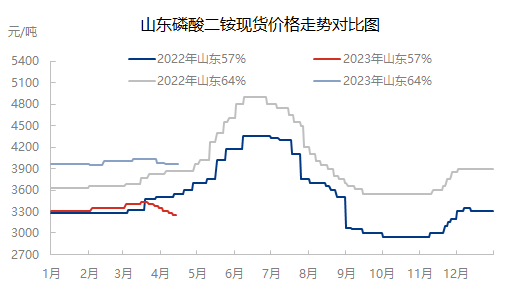 以山东市场为例,2023年国内磷酸二铵市场经历了1季度的相对平稳后,进入2季度市场出现震荡下滑,目前山东64%出库报价3950-3980元/吨,57%出库报价3200-3250元/吨,两者价差达到700-750元/吨。从上图2022-2023年山东市场价格走势对比图来看,目前山东57%含量价格已低于2022年同期水平,同比降幅在8.45%,山东64%二铵报价仍在高位,同比2022年同期价格还上涨了2.33%。