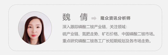 综上所述,原料硫磺、合成氨行情预期仍旧偏弱,磷矿石价格亦有下滑预期,成本支撑乏力,国内市场需求显淡,再有国际价格持续下滑,国际需求跟进有限,短期看行情无明显利好支撑,预计磷酸二铵价格仍有下滑预期。