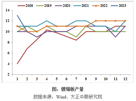 2023年2月,镀锡板产量为10万吨,环比减少-23%,较去年同期减少0万吨。