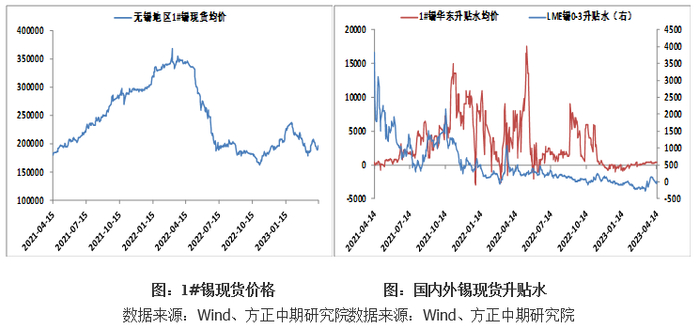 4月14日当周,现货锡价持续走跌,市场心态仍然偏弱,周内最低触及189000元/吨,最高196500元/吨。周内华东升贴水,最高价升水期货800元/吨,最低,截至4月14日华东锡价均价升水400元/吨。