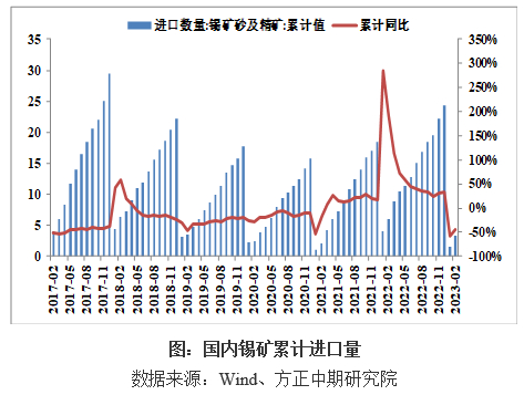 海关数据显示,2月份锡矿砂及精矿进口量17174吨,同比下降13.04%;1-2月累计进口量33573吨,同比下降43.78%。