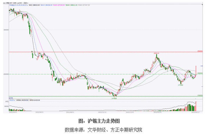 近期沪锡盘面有所反弹,叠加上突发事件的影响,锡大部分月份合约呈现全面涨停的态势。主力沪锡2305合约,收盘在218700元/吨,上涨20820,涨幅10.52%。下一涨停板12%。伦锡在周一开盘后也开始跟涨沪锡。