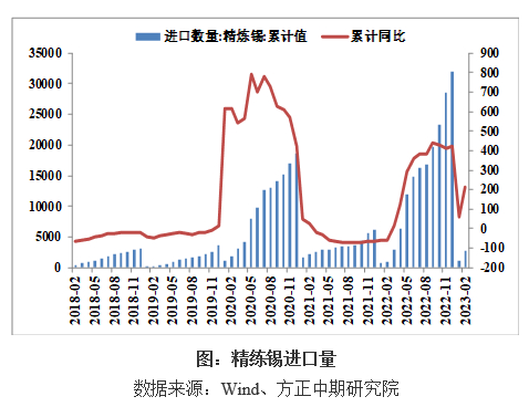 1月精炼锡进口窗口处于关闭状态,之后逐渐开启且维持着微幅盈利的状态。海关最新数据显示,2023-02月精练锡进口量1,638.32吨,环比50.40%。