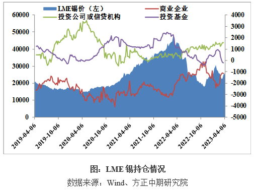 锡价自2023年一季度触底以来一直延续震荡行情。投资公司及投资基金净多头持仓呈现出相反走势。截止4月6日,LME锡投资公司或信贷机构净多持仓为1,598手,较上一周减少-3手。LME锡投资基金净多持仓为89手,较上一周增长76手。LME锡商业企业净多持仓为-1,431手,较上一周减少21手。