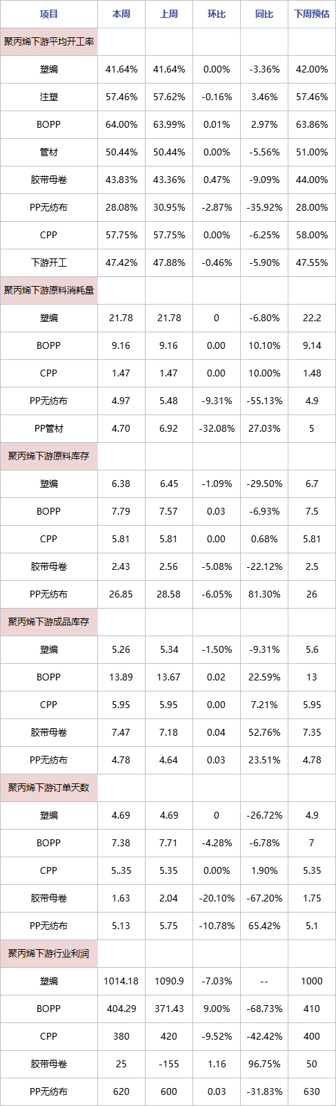 本周聚丙烯下游各行业开工小幅下滑,整体变动不大,较上周环比-5.90%,注塑、PP无纺布行业开工小幅下滑,胶带母卷略有走高,其余行业持稳为主;消耗量方面,PP无纺布及PP管材原料消耗量有所减少,其余下游产品暂无变动;本周PP延续弱现实,下游需求表现欠佳,需求端延续弱势,成交量不及预期,终端接货不乐观,导致市场承压运行。PP下游各行业原料库存有涨有跌,多延续刚需补货,成品库存多小幅上涨。短期PP下游各行业对原料或维持刚需补货的节奏,塑编市场消耗前期订单为主,后上行动力不足;BOPP及CPP行业表现依旧不温不火,价格多稳中调整,BOPP利润略有增加,CPP利润缩减;胶带母卷成交放量有限,场内供需矛盾暂无缓解,PP无纺布工厂近期开工震荡下滑,新接订单下滑,整体需求不高,市场较弱;PP订单情况相比往年明显不足,订单比较少;PP管材下游工厂需求暂无改善,采购积极性表现不佳。