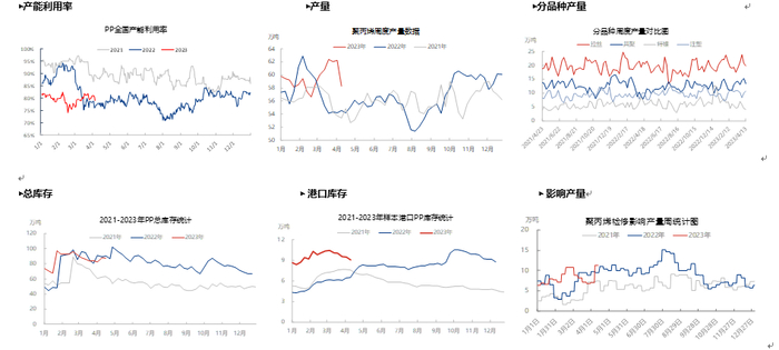 从聚丙烯主要下游领域来看,订单不足是制约开工的主要原因,随着薄膜消费转淡,叠加部分企业陆续进入检修,整体开工小幅下滑;注塑方面,新能源汽车企业订单表现良好,部分企业反馈订单已接至5月份,但是日用、托盘、板材等领域订单依然不佳制约行业整体开工。PP无纺布由于口罩需求“断崖式”下跌,工厂停工现象普遍,开工持续下滑并消耗成品库存中。