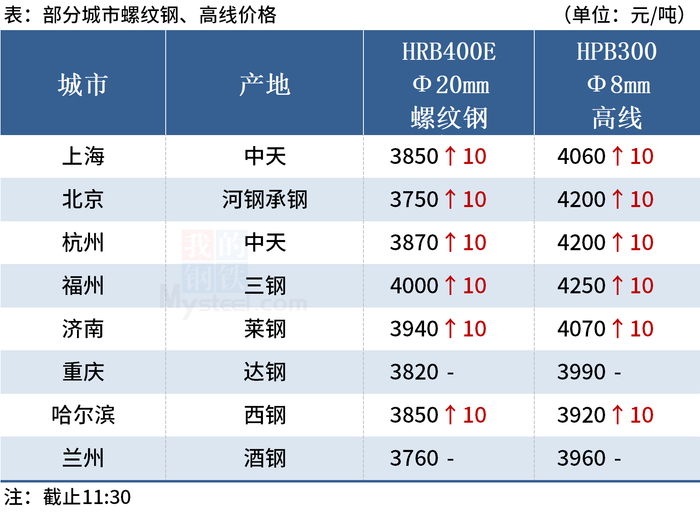 ◎上海:27日早盘建材市场价格部分上涨10。现螺纹3770-3820,西城抗震3810,其他3670-3720,兴鑫抗震3730,联鑫黄海抗震3740,盘螺3890-4080,高线亚新3860,Mysteel上海螺纹钢价格指数3809跌5。(单位:元/吨)