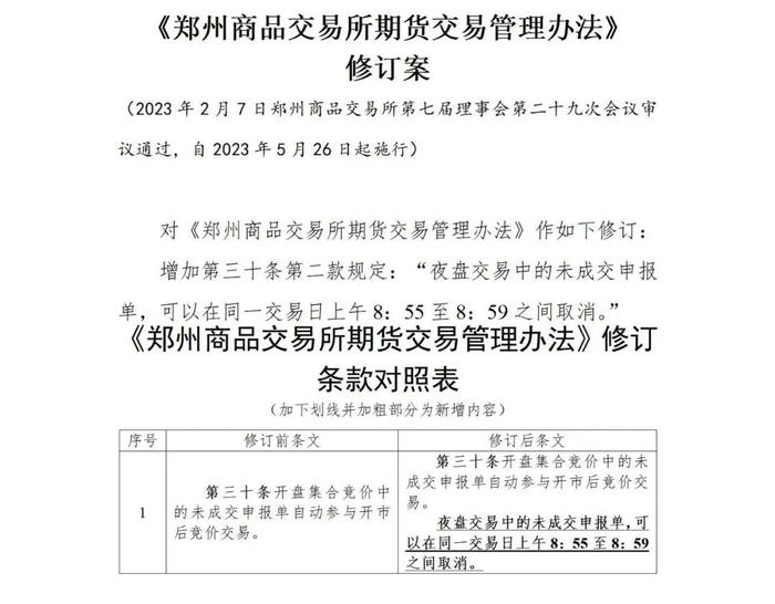 根据郑商所公告内容,此次修订增加了“夜盘交易中的未成交申报单,可以在同一交易日上午8:55至8:59之间取消”的规定,自5月26日起正式生效,生效后,交易者可以按照规定根据自己的意愿取消夜盘交易中未成交的申报单。