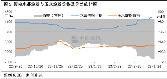 玉米淀粉与木薯淀粉由于产品特性的一致性,在下游造纸、变性淀粉及食品行业存在相互替代关系,正常合理价差在300-400元/吨。一季度玉米淀粉价格先抑后扬,由于木薯淀粉价格上涨过快,两者之间价差拉大。据卓创资讯统计,1月初两者价差为750元/吨,4月23日扩大至1115元/吨。即玉米淀粉对木薯淀粉的替代作用增强,挤占部分木薯淀粉市场份额。