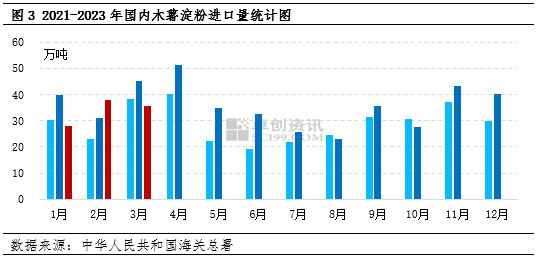 近年我国木薯淀粉的进口依存度为90.41%,因此进口量对于国内价格影响比较大。据海关数据显示,2023年一季度中国进口木薯淀粉约101.63万吨,较2022年同期减少12.70%。进口量之所以减少,主要是泰国榨季原料供应减产导致的,其次是外盘报价持续上涨,影响贸易商补货积极性。