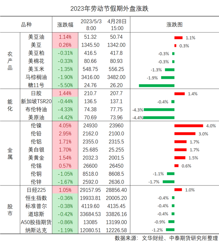 节日期间,国内期货市场休市,国外原油等能源类品种价格出现较大幅度下跌,截至5月2日,WTI 6月原油期货较前日收跌4.00美元,跌幅5.29%,报71.66美元/桶。布伦特7月原油期货较前日收跌3.99美元,跌幅5.03%,报75.32美元/桶。国外市场又开始担心美元加息以及银行危机,市场短期悲观气氛较浓厚。