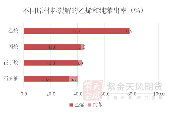 乙烯裂解的主流原材料有乙烷、丙烷、正丁烷和石脑油,四种原材料的乙烯出率依次降低。2022年原材料成本大幅上涨,再加上终端需求疲软,乙烷和石脑油裂解亏损严重,丙烷和丁烷也处于盈亏平衡附近,裂解产出的纯苯减少。