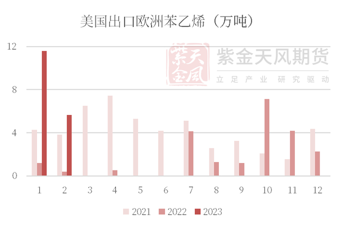 2023年苯乙烯计划检修损失量远小于前三年,欧洲经济担忧也稍有缓解。观察1-2月出口量可知,美国出口至欧洲窗口已正常开启,预计23年出口量级为80万吨左右,那么整体出口量将达到190万吨(美洲110+欧洲80)。