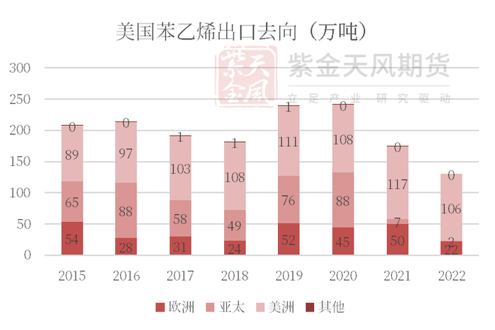 苯乙烯需求可分为外需和内需两部分。美国是苯乙烯的净出口国,出口量占总产量的40-50%。由于全球苯乙烯新装置大量投产(尤其是中国),利润压缩至盈亏平衡附近甚至亏损,运费成本成为进出口市场重要的竞争力,中国和美国分别抢占亚洲和美洲的出口市场。美国苯乙烯出口结构在2021年发生转变,到亚太的出口消失,只剩下运往欧洲和美洲的,未来出口至亚洲窗口将处于关闭状态。