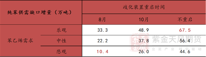 美国纯苯供应方面,裂解和重整的纯苯出率变化不大,歧化装置的重启时间会对供应造成较大影响。假设歧化装置在8月重启、10月重启或者年内不重启,纯苯供应将增加6.2万吨、减少9.4万吨或减少28.0万吨。