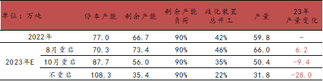 假设未停车的歧化装置负荷为90%(2022年水平),如果歧化装置在8月重启,23年纯苯产量将增加6.2万吨;如果在10月重启,产量将减少9.4万吨;如果年内不重启,产量将减少28.0万吨。