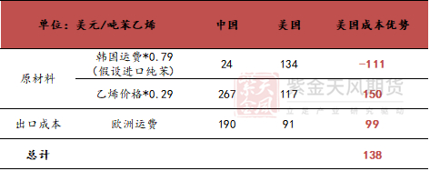 出口美洲的量级稳定在110万吨左右,欧洲市场需要与中国竞争。对比中美出口欧洲成本,美国在欧洲市场更具优势。假设中美均从韩国进口纯苯生产苯乙烯再出口到欧洲,每生产一吨苯乙烯,美国成本要比中国低138美元。