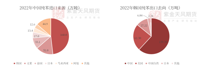 近年来苯乙烯产能急速扩张,苯乙烯端短期内很难给出利润,绝对价格的波动主要依赖纯苯。中国纯苯进口依赖度较高,进口量对纯苯供需起着决定性的作用,韩国是我国第一大进口来源国,2022年韩国进口占比48.5%。在韩国的出口分布中,中国和美国为前两大出口去向,分别占比61.8%和24.2%,中美纯苯进口量级之间存在极大的关联性。