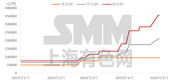 此外,2023年第一季度中层砂价格上涨的原因主要由于国内龙头企业检修、停产等影响导致中层砂放量有所减少,中层砂供应亦有所紧张,需求量的增多同步带动中层砂价格上涨。而对于外层砂来说,国内外层砂生产企业较多,供应量充足,价格上涨支撑力有限。