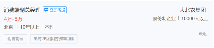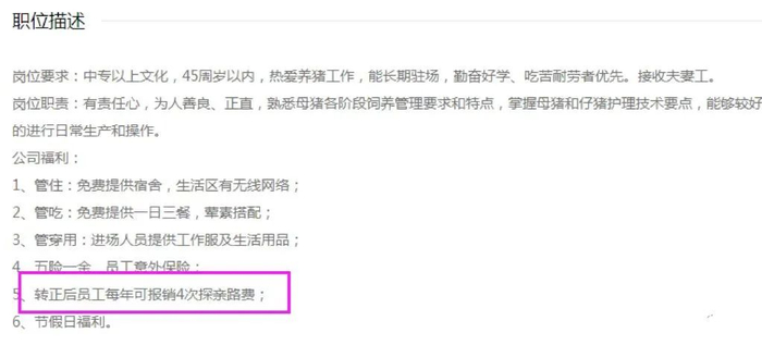 小编翻看大北农招聘信息时发现了一个职位招聘消费端副总经理,给出的待遇十分诱人,本科学历,月薪4W—8W;另外还发现了一个亮点龙岩地区招聘猪场技术员岗位,提供五险一金及意外险,管吃管住管穿用,重点是转正后的员工每年可报销4次探亲路费,这一点可以说待遇很棒了。
