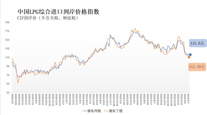5月8日-14日中国液化丙烷、丁烷综合进口到岸价格指数为115.8点、112.19点