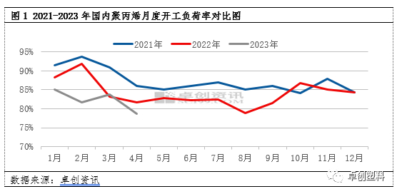 据卓创资讯数据统计2022年国内聚丙烯装置整体开工负荷率在78.83%-91.91%左右运行,各月开工负荷率多低于去年同期水平。进入2023年月度开工负荷率再次持续低位,在过去的4个月除3月开工负荷率略高于同期外,其他月份均低于去年同期水平,且4月达到78.62%为近五年内的低点。分析来看,企业整体低负荷运行,主要原因来自于聚丙烯低价运行下,企业利润的缩减。