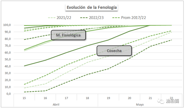 截至上周晚些时候,2022/23年度阿根廷大豆收获率为78.2%,而去年为91.4%,平均收获率为91.7%。这意味着本周上涨了8%。在核心产区,大豆收获了92-97%,而50-65%的大豆收获在阿根廷南部,42-52%的大豆收获在阿根廷遥远的北部。早播大豆收获80%,晚播大豆收获44%。