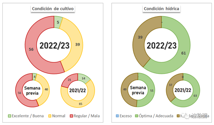 截至上周晚些时候,阿根廷大豆的评级为56%为差/极差,39%为一般,5%为好/优。与前一周相比,良好/优秀的百分比没有变化。土壤湿度39%为短/极短,61%为优/最佳。