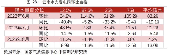 云南6-8月水力发电量环比改善较大,但同比2022年仍有差距。下图表格中列出了五种降水情景下,2023年6-8月发电量同环比的情况。环比来看,随着降水量的季节性恢复,6-8月发电量在所有降水情景下均逐步恢复。其中6月及7月环比恢复明显,在平均降水情境下,分别达到了83.2%及21.2%。同比来看,6-7月同比距离往年仍有差距,但7月同比数据比6月同比数据高,说明云南水电在6月底至7月较较大程度改善。观察8月数据,可以发现同比已经超越2022年同期约10%,主要因2022年云南雨季偏早,水电峰值出现7月。