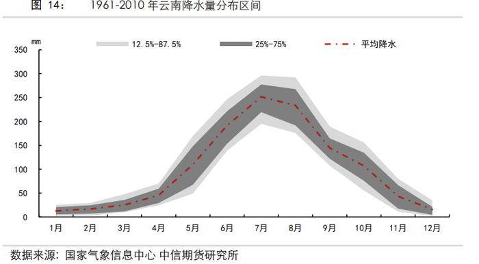 从历史数据来看,云南降水量主要集中在6-9月,10月至次年5月降水量偏少。通过统计1961-2010年7个气象站点的降水量数据,可以观察到云南历史上6月降水将显著改善,并持续至7月。(7个站点分别位于云南水系的上中下游,分别为:腾冲、昆明、德欣、思茅、临沧、澜沧、丽江)