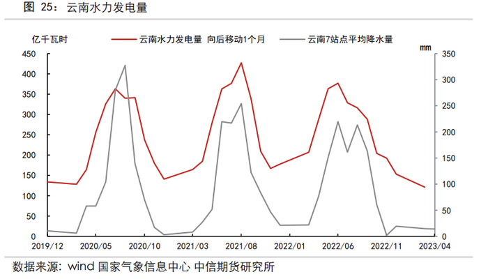 云南水力月度发电量与该省上月降水量呈现高度相关性。回测2019年12月底至2023年4月的云南月度水力发电量及云南7个气象站点统计的平均降水量,我们发现当月水力发电量与前一月平均降水量相关系数为0.87,高于当月发电量与当月降水量之间的相关系数0.78。