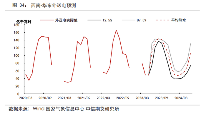根据模型预测结果显示,2023年西南-华东外送电同比偏低,华东缺电风险偏高。在平均降水的情景下,预计2023年6-8月外送电量约108、136、143亿千瓦时,环比逐步增加,但同比2022年6-8月将分别下降20.8%、17.9%、1%。因此,若华东及华南地区最高负荷发生在7月,则缺电风险较高,若最高负荷发生在8月,则缺电风险及持续时间或相对偏低。具体强度需观察7-8月气温及负荷情况。
