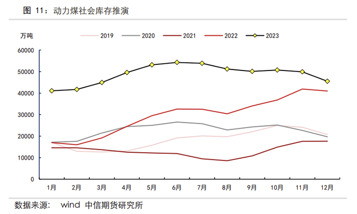 我国能源保供成效明显,煤炭供需宽松,库存持续走高。2022年我国原煤产量45.6亿吨,同比增长10.5%,全年进口煤达到2.93亿吨,同比下降9.2%,国产煤加进口煤数量合计较上年增长约9%。当年我国煤炭消费量约30.4亿吨标准煤,同比增长4.3%。煤炭供需宽松形势在2022年已经较为明显,在全社会库存持续累积中已有明显体现,且这一形势在2023年进一步加强。