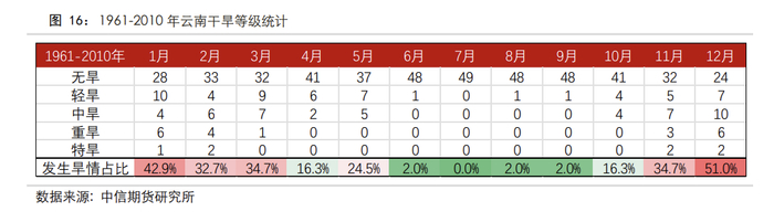 预计云南将在6月水电加快恢复,且历史上云南6-9月发生干旱的概率偏低。采用降水量距平百分率干旱等级指数对1961-2010年的云南降水量进行筛选,我们发现过去49年里的6-9月,共计196个月,仅有3个月曾发生干旱。因此,从历史回溯来看,云南水电将从六月底加快恢复。