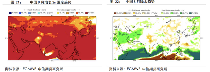 中国8月气温大概率高于常值,降水目前维持中性判断。根据中期天气预测,东亚地区8月地表2m的温度极大概率高于常值;中国华北、华中地区降水小幅偏少。