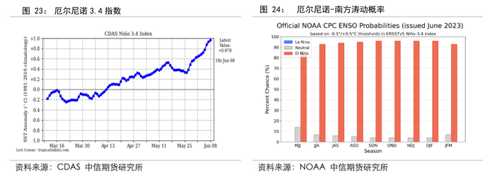 2023年或发生厄尔尼诺,夏季气温或超预期。厄尔尼诺3.4指数在五月底达到+0.5摄氏度,海水温度达到厄尔尼诺事件判定标准,但持续时间仍待观察。