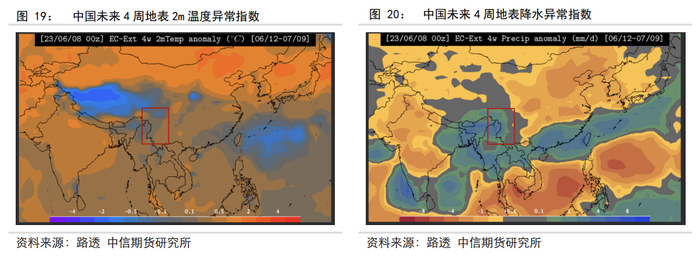 从未来4周天气展望来看,云南降水持续,气温偏高概率较大。下图分别展示了未来四周气温及降水异常指数。具体到云南地区来看,未来四周气温预期小幅偏高与与常值0.1-0.5摄氏度;未来四周降水,澜沧江及金沙江上游预期迎来高于常值约1-4毫米/日的降水,同样有助于云南地区水电恢复。