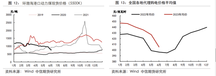 今年发生缺煤危机的概率极小,且煤价下行趋势明确,带动电价成本降低。2022年11月开始,国内动力煤价格开始进入下行通道,截至2023年6月8日,环渤海港口5500大卡动力煤现货价格跌至800元/吨附近,较2022年高价几近腰斩。基于目前产业链高库存状态,