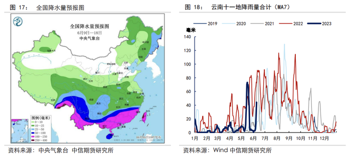 展望短期10日天气,云南降水恢复,正式进入雨季。根据中央气象局6月9日至18日的降水量预报,中国大部地区将迎来降水。目前旱情最严重的云南地区将迎来较为丰富的降水,旱情有望缓解,水力预期将逐步恢复。(恢复节奏详见第四章节)