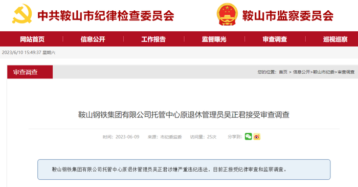 2023年6月9日,据中共鞍山纪律委员会消息:鞍山钢铁集团有限公司托管中心原退休管理员吴正君涉嫌严重违纪违法,目前正接受纪律审查和监察调查。