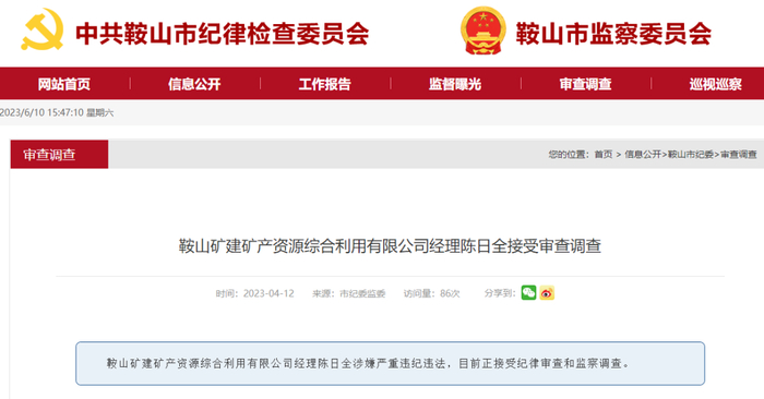 2023年4月12日,据中共鞍山纪律委员会消息:鞍山矿建矿产资源综合利用有限公司经理陈日全涉嫌严重违纪违法,目前正接受纪律审查和监察调查。据了解,陈日全在鞍钢工作20多年,曾任鞍钢矿业附企实业有限公司管理部部长、副经理、经理。