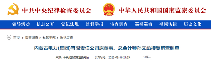 2月16日晚间,内蒙古纪委监委发布消息,内蒙古电力(集团)有限责任公司原董事、总会计师孙文彪涉嫌严重违纪违法,目前正接受内蒙古自治区纪委监委纪律审查和监察调查。据资料显示,此前,孙文彪曾任包钢财务处会计科科长、包钢(集团)公司财务部部长助理、包钢(集团)公司计划财务部副部长、包钢(集团)公司副总会计师。