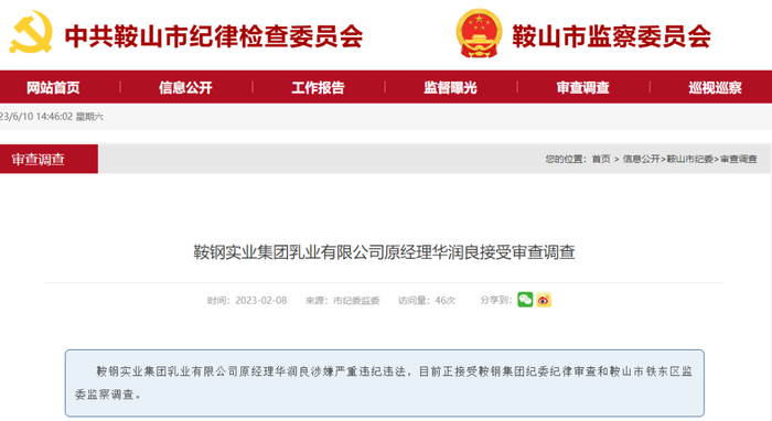 2023年2月8日,据中共鞍山纪律委员会消息:鞍钢实业集团乳业有限公司原经理华润良涉嫌严重违纪违法,目前正接受鞍钢集团纪委纪律审查和鞍山市铁东区监委监察调查。