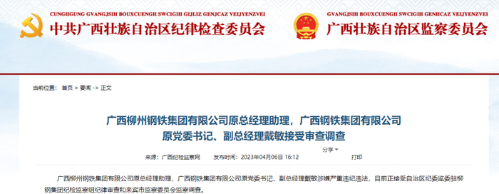 4月6日广西纪检监察网发布通报,广西柳州钢铁集团有限公司原总经理助理,广西钢铁集团有限公司原党委书记、副总经理戴敏涉嫌严重违纪违法,目前正接受自治区纪委监委驻柳钢集团纪检监察组纪律审查和来宾市监察委员会监察调查。