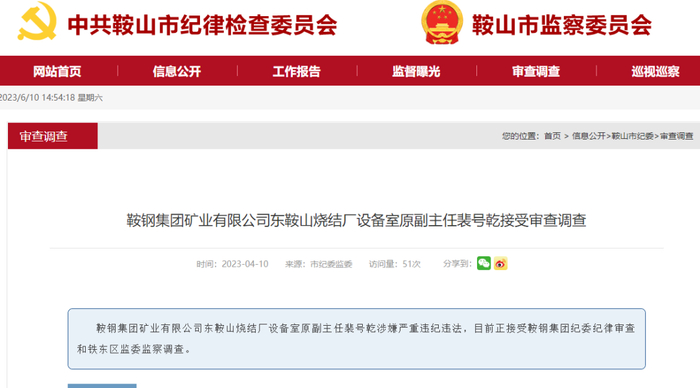 2023年4月10日,据中共鞍山纪律委员会消息:鞍钢集团矿业有限公司东鞍山烧结厂设备室原副主任裴号乾涉嫌严重违纪违法,目前正接受鞍钢集团纪委纪律审查和铁东区监委监察调查。