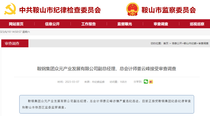 2023年3月7日,据中共鞍山纪律委员会消息:鞍钢集团众元产业发展有限公司副总经理、总会计师姜云峰涉嫌严重违纪违法,目前正接受鞍钢集团纪委纪律审查和鞍山市铁西区监委监察调查。