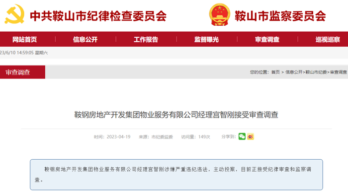 2023年4月19日,据中共鞍山纪律委员会消息:鞍钢房地产开发集团物业服务有限公司经理宫智刚涉嫌严重违纪违法,主动投案,目前正接受纪律审查和监察调查。