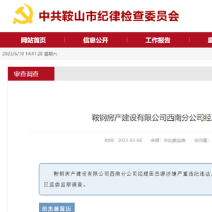 2023年2月8日,据中共鞍山纪律委员会消息:鞍钢房产建设有限公司西南分公司经理田忠源涉嫌严重违纪违法,目前正接受鞍钢集团纪委纪律审查和鞍山市铁东区监委监察调查。