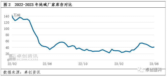 厂家库存低位,挺价情绪明显。6月份纯碱厂家接单情况有所好转,轻碱库存下降明显,截至6月21日,国内纯碱库存在40.7万吨,环比增加2%,维持40万吨左右的偏低水平。当前多数厂家待发订单半月左右,部分厂家控制接单,新单价格有所上涨。截至6月21日,国内轻碱主流出厂价格在1900-2050元/吨,重碱主流终端价格在2050-2250元/吨,月内国内轻碱市场均价上涨2%,重碱均价上涨1.4%。