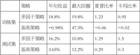 下面笔者用回测来验证模型的效果,取沪金期货主力合约为交易对象。由于因子基本都来自外盘数据,考虑到时差因素,为确保回测中没有引入未来数据,将T日因子产生的交易信号放在T+1日的日盘开盘时刻进行交易,交易费用设定为开平仓各万分之二,不使用杠杆。多因子策略和基准策略(买入持有策略)在训练集(样本内)和测试集(样本外)的表现分别如下图和下表所示。很显然,无论是在训练集还是在测试集,多因子模型的表现都要明显优于基准策略。